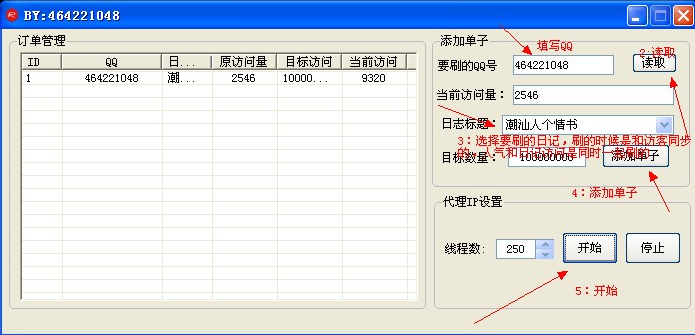 2、填上QQ号,点读取,选择要刷的日记,刷日记的同时,访问量也会跟着增加的!然后点添加单子,那个数量不用去管它,一定要添加单子,要不然的话你刷不了的!