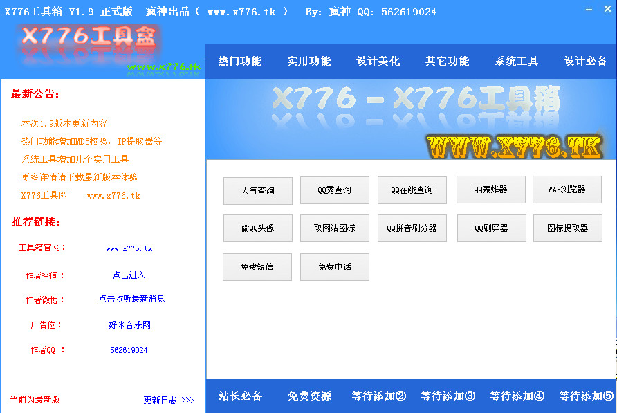 实用功能:人气查询、QQ秀查询、QQ在线查询、QQ轰炸器、WAP浏览器、偷QQ头像、取网站图标、QQ拼音刷分器、QQ刷屏器、图标提取器、免费短信、免费电话