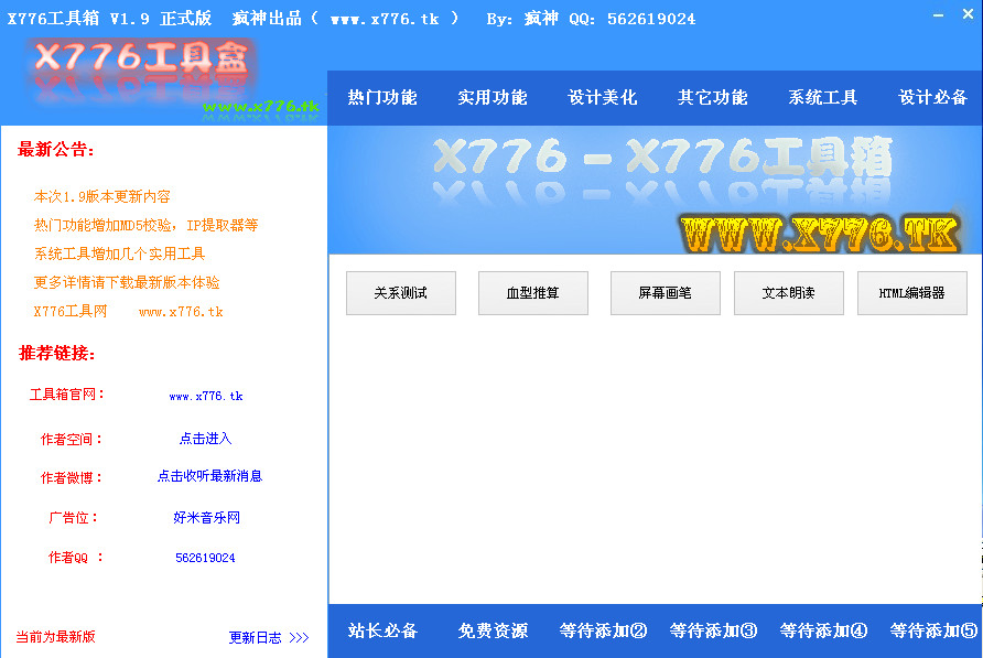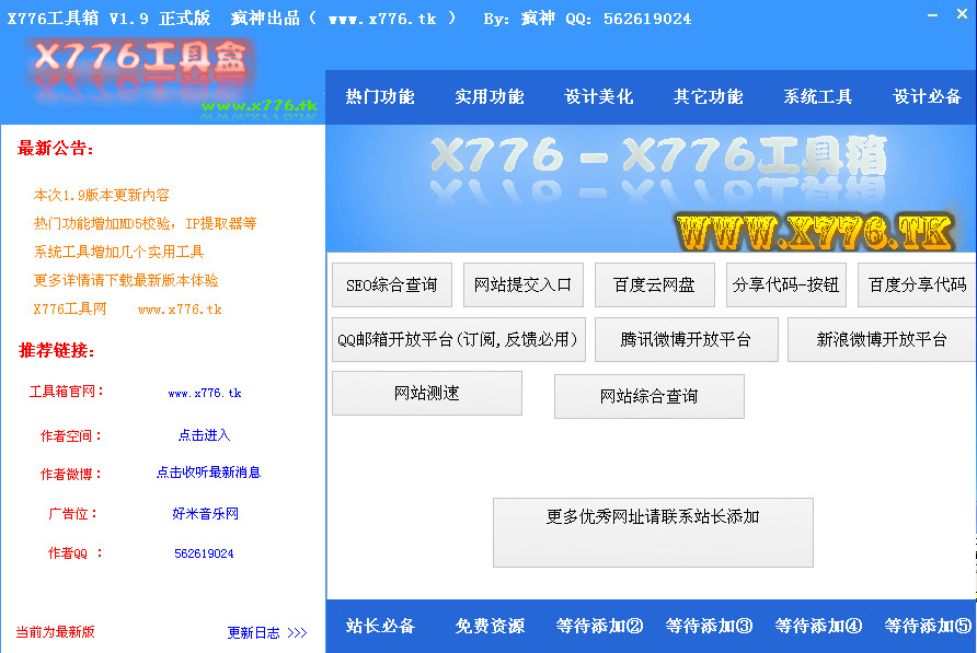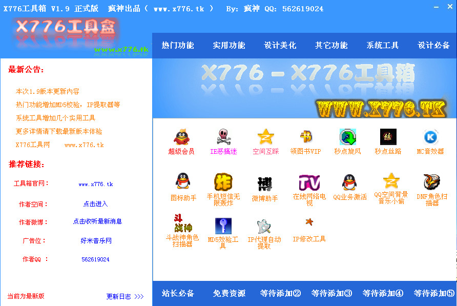 热门功能:超级会员、IE恶搞迷、空间互踩、领图书VIP、秒点旋风、秒点丝路、MC音效器、图标助手、手机短信无限轰炸、微博助手、在线网络电视、QQ业务激活、QQ音乐背景小偷、DNF角色扫描器、斗战神角色扫描器、MD5校验工具、IP代理自动提取、IP修改工具