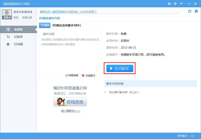3.已登陆状态下,如您未订购该脚本,点击“启动脚本”按钮后均为试用状态
