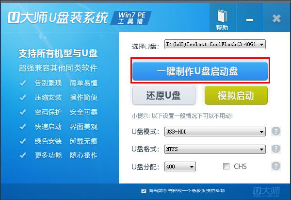1.首先插上U盘然后双击运行电脑桌面上“U大师装系统Win7工具箱”的图标,该工具能够自动识别出插入电脑USB接口的所有USB设备,请选择要制作成启动U盘的盘符,然后可以根据个人情况,分别设置启动模式和系统格式,如图: