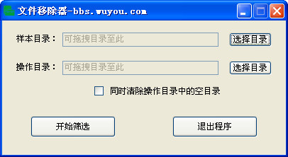 A目录中有文件a.dll、b.exe、c.ini,欲删除之,并删除A目录其他位置(含子目录)与a.dll、b.exe、c.ini相同(取决于SHA1校验值,与文件名无关)的文件,则可先新建目录B并将a.dll、b.exe、c.ini移至目录B中,然后“样本目录”选择“B”,“操作目录”选择“A”,若勾选“同时清除操作目录中的空目录”(“样本目录”不选择时该功能单独工作)则A目录中的空目录会被删除。安全起见,删除时文件会被暂时移至程序同级的“文件回收”目录(注意:执行操作时该目录会被清空)。
