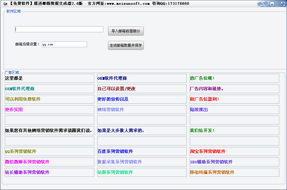 打开软件,导入邮箱的前面部分,设置邮箱后缀,点击生成邮箱数据并保存。