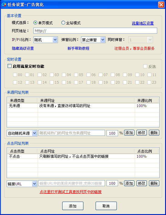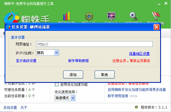 4. 蜘蛛手软件的设置强大,控制精准。蜘蛛手具有可预设刷流量的时间,流量的来源地址,流量的跳转地址等众多功能。