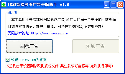 平常大家在网上看视频的时候,是不是经常被越来越长的广告和弹窗骚扰的烦不胜烦呢,这里给大家推荐一款IE浏览器网页广告去除助手,支持腾讯、新浪、搜狐、网易等主流网站,让你在浏览网页的时候有个绿色干净的浏览环境,免去弹窗和广告的骚扰,非常方便实用。