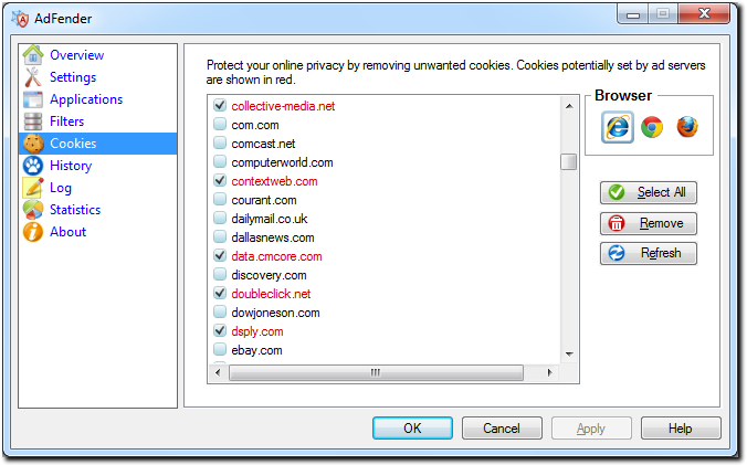 adfender可以让你查看和/或删除已保存的Cookies在Internet Explorer,Firefox和谷歌浏览器。从广告主或分析器,所有的Cookies在Cookies中出现红屏,如下图所示。