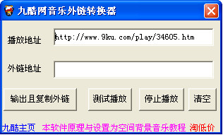平常我们在做QQ空间里的音乐时,如果不是绿钻,免费播放的话只能通过外链歌曲播放,给大家介绍一款九酷网音乐外链转换器,可以帮助你快速将音乐转换成外链地址,这样就可以在空间播放了,制作QQ空间背景音乐就容易多了。