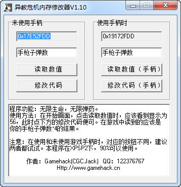 程序功能:无限生命,无限弹药。使用方法:在开始画面,点击读取数值时,应该看到显示为56,此时点下方的修改代码便可。在游戏中读到的应该是你的手枪子弹数*4的结果。