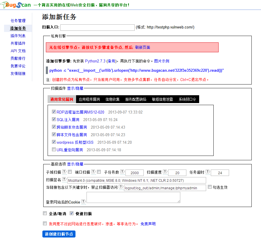 BugScan是一个简单实用的web安全漏洞在线扫描器,由用户自己创建扫描中间节点,bugscan提供任务调度,以及扫描插件维护等,这是一款非常不错的扫描器,近百个扫描插件使得它在漏洞扫描范围上非常广,另外精确度及速度也是不得不拍手称赞的。