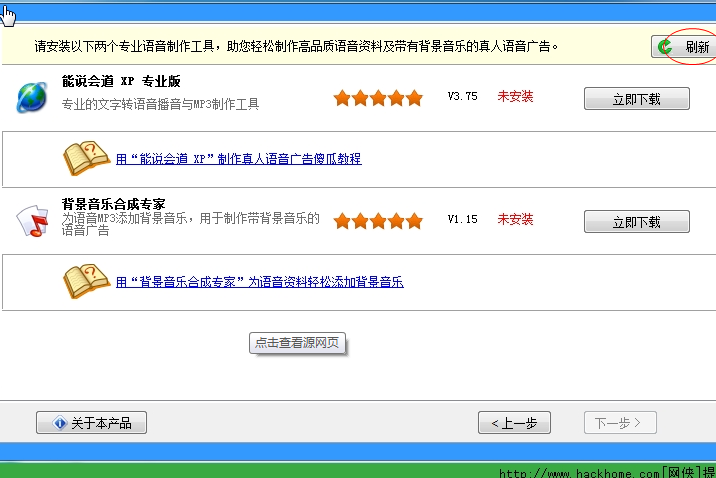 3、完成安装后,点击右上角的“刷新”按钮,如果显示绿色的“已安装”,则表示安装成功了。点击“能说会道 XP 专业版”右方的“打开”按钮即可开始使用“文字转语音”软件输入文字内容制作语音MP3。点击“背景音乐合成专家”右方的“打开”按钮即可开始使用“背景音乐合成专家”,为语音MP3添加背景音乐及广告特效。如果对这两款专业制作工具的具体使用方法不甚了解,可分别点击“书本”图标,打开教程参考使用方法,一看就会。