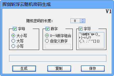 挥剑斩浮云随机密码生成器可以随机生成33长度的高强度密码,支持大小写字母、数字以及字符。