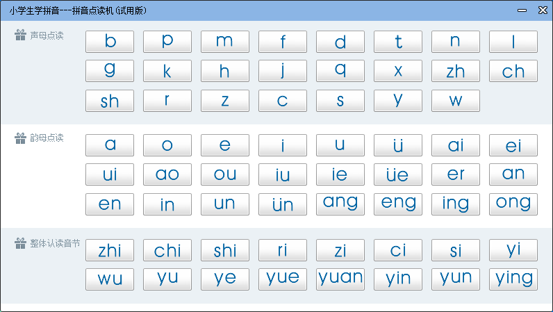 这款拼音点读机是一个小学生拼音学习软件,包括声母、韵母和整体认读音节的学习。
