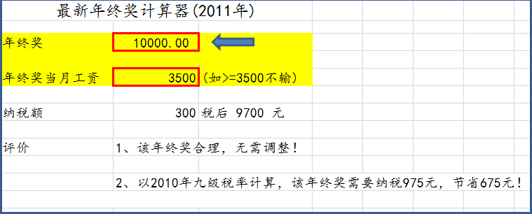 例如:年终奖为10000元,年终奖当月工资为3500,那么纳税额就是300元,税后应发9700元。
