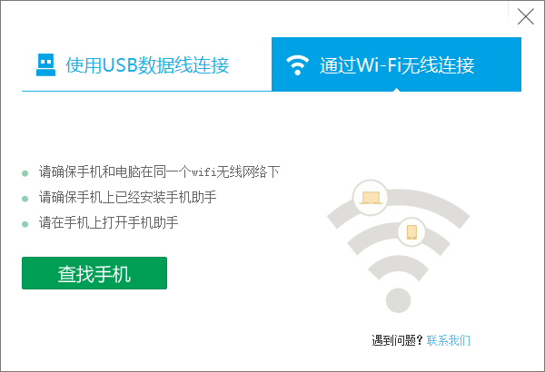 点击客户端首页“连接手机”按钮,开始进行连接,您可以选择USB连接、WI-FI连接两种连接方式,USB连接就是通过数据线连接,wif连接通过无线网络进行连接,首先我们来看一下USB连接: