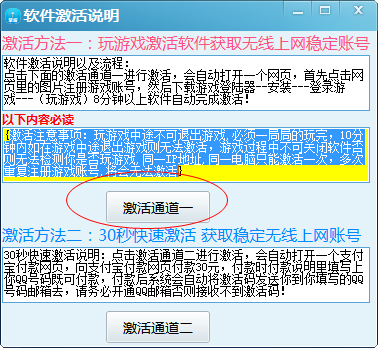 点击“激活通道一”进行激活,会自动打开一个网页,首先点击网页里的图片注册游戏账号,然后下载游戏登陆器--安装---登录游戏---(玩游戏)8分钟以上软件自动完成激活!