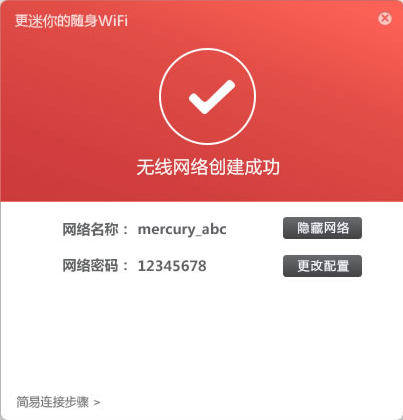 3、无线网络创建成功后,屏幕自动出现网络名称与密码