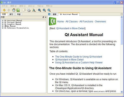 (6)运行Qt Assistant。可以通过命令“qassistant -collectionfile doc.qhc”打开qassistant,打开后即可浏览到我们自己的帮助文档了。当然如果是在程序中,可以通过QProcess来调用assistant.exe,并给出相应的collectionfile参数即可。