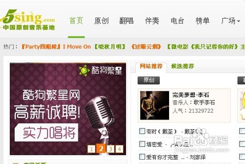 首先我们来到5sing网,直接百度5sing第一个就是。然后选择我们想要下载的歌曲,如果你是想要下载指定的歌曲,还可以通过搜索选项来定位你要下载的歌曲,搜索的时候要选择分类,要不可能搜索不到你想要的结果哦。