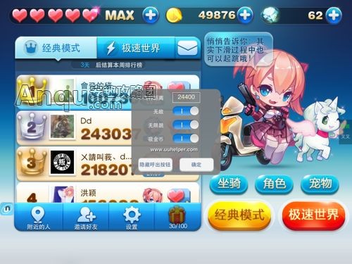 3、安装完成之后我们进入天天酷跑游戏,点开UU助手,设置飞行距离24400米(建议不要超过),开启无敌,开启无限跳,如果之前你安装了叉叉助手,请记得先关闭叉叉助手哦!