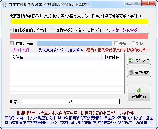 文本文件批量修改器是一个批量删除单个/大量文本文件内容中相同字符的小工具,支持批量查找、删除、替换,使用简单方便。