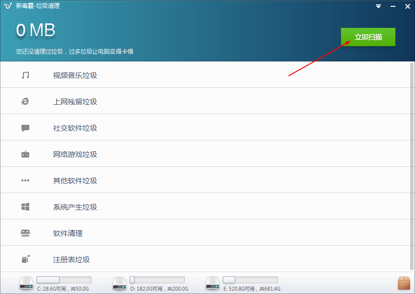 1、启动新毒霸垃圾清理软件,点击【立即扫描】按钮扫描电脑中的垃圾文件