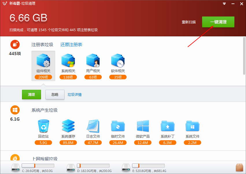 这是从新毒霸中提取出来的一个独立版的垃圾清理软件,帮你一键清理系统盘垃圾。方便携带,随时随地打开,一点即可。