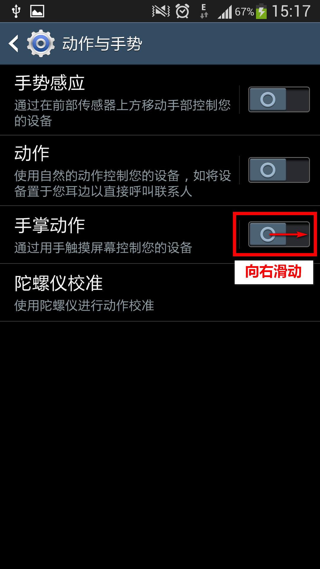 5.向右滑动【手掌动作】选项右侧的长方形滑块,显示绿色代表已开启,然后点击【手掌动作】。