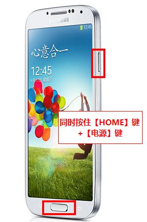 在待机状态下,同时按住屏幕下方的【HOME】键和机身右侧上方的【电源】键,听到声音或振动后松手。