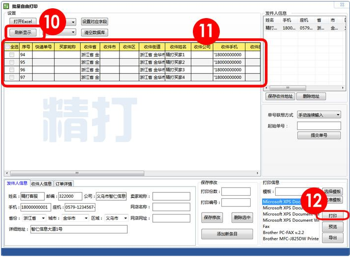 在⑪中选中一个或者多个订单,选中一个快递单模板和打印机,点击打印,即可输出打印内容了。