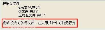 打开压缩包后,会判断里面是否有可执行文件,如果没有,或者有多个,会有提示火眼报告可能无行为。