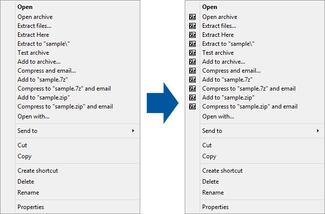 当我使用WinZip或WinRAR的,我可以很容易地找到在资源管理器上下文菜单WinZip或WinRAR的菜单项。有与菜单项图标。然而,7 - Zip不提供这个功能。所以我决定把特征。当它完成的时候,上下文菜单看起来像下面的截图。