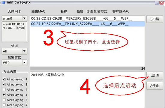 4、找到无线网卡后,选择你要破解的路由,然后点启动;