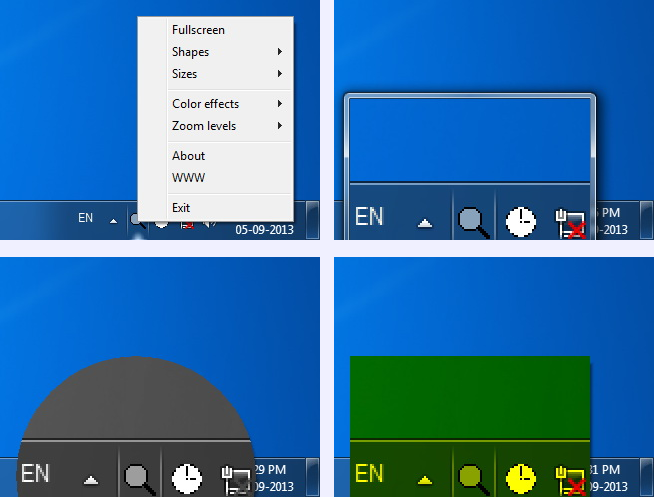 支持形状和放大镜窗口大小的选择,缩放,放大的色彩效果。它可以运行在全屏模式。