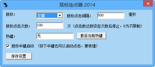 鼠标连点器2014,功能非常的简单,开启后程序会模拟鼠标进行自动点击。如果你在平时的游戏或是工作中经常需要大量点击鼠标左键或右键,那么一定有大量点击鼠标的操作,非常浪费时间,浪费精力,而且还消耗鼠标!这个小软件可以解放你的手指啦!