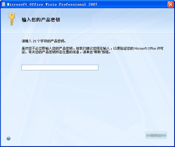 2、安装时会提示需要输入密钥,小编这里为大家提供一个能用的安装密钥,复制进去即可:visio2007产品密钥: W2JJW-4KYDP-2YMKW-FX36H-QYVD8