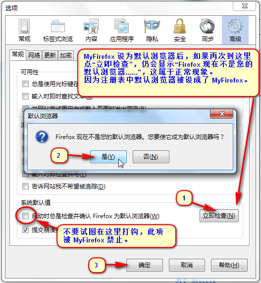 MyFirefox 不会强制地、自动地将 Firefox 设为默认浏览器,而是基于这样的思路:当检测到由 MyFirefox 启动的 Firefox 被您设为默认时,将浏览器路径重定向到 MyFirefox。因此要设置默认按以下步骤: