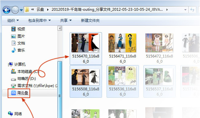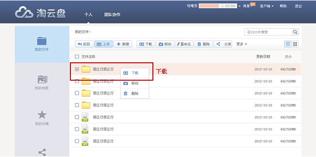 如果您安装了客户端,可以直接复制文件到淘云盘专用文件夹,系统会自动将文件同步到云端,