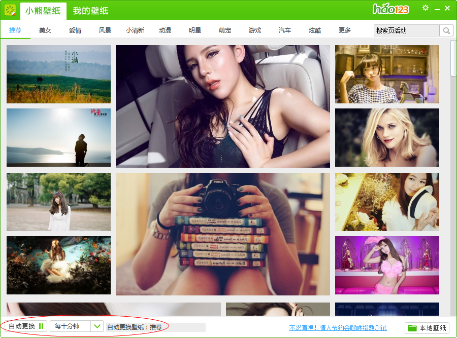 先打开想要自动更换的壁纸分类,比如要自动更换美女壁纸,就进入“美女”壁纸分类里面,然后点击软件左下角的“自动更换”,设置自动更换壁纸时间就可以了。
