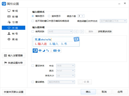 3、在数学设置——外观中可以设置光速输入法皮肤和字体颜色