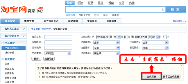 第二步:在搜索条件栏中输入需要导出记录的具体条件(如选择从活动上线的日期到结束日期),点击“批量导出”按钮导出卖出宝贝记录。