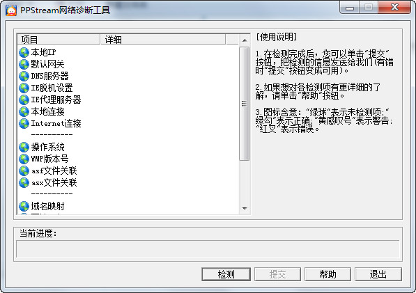 PPStream网络诊断工具是专门在pps中提取出来的网络诊断工具,它原本的功能主要是用来诊断PPS网络电视的网络故障,其实这个软件也可以用在日常的网络诊断,能基本诊断及解决一些常见的网络问题,非常实用个的一款小工具。