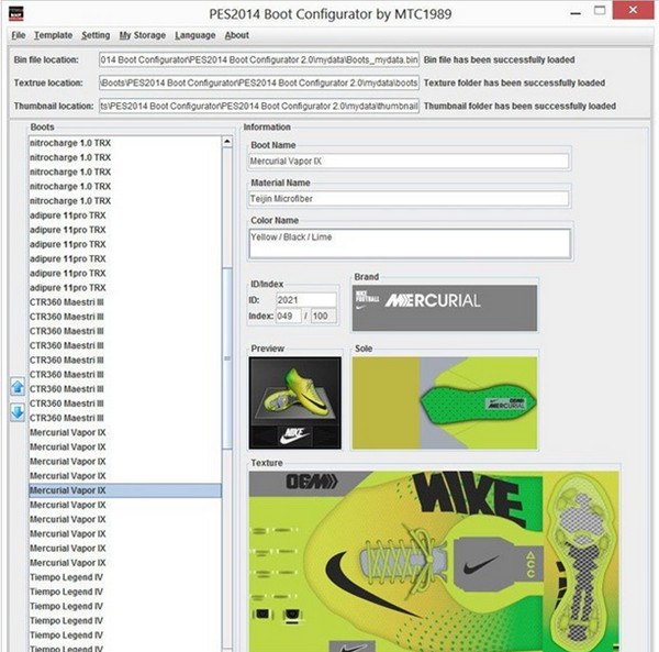 实况足球2014球鞋文件配置器,是一款专门针对游戏中球员球鞋各种信息和接口的修改工具,这个修改器不适合那些想要修改游戏中球鞋贴图或者替换球鞋模型的玩家。本修改器支持在FileLoader/ CPK打包模式下使用,而且对于那些没有修改经验的玩家们来说,并不是非常推荐使用本修改器来进行游戏内容修改,错误的修改很可能造成你的球鞋信息混乱。
