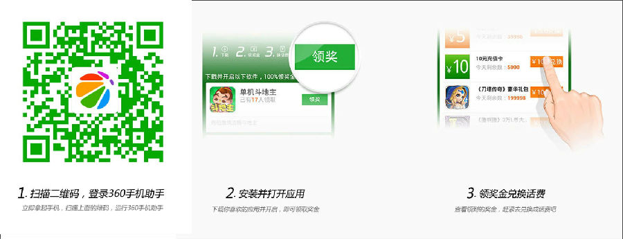 安卓手机用户只需扫描360手机助手提供的安全绿色二维码,下载里面的软件和游戏,话费就会马上到手,比等老板发工资更准时靠谱。安静地等着话费“蹭蹭”地往上涨吧!