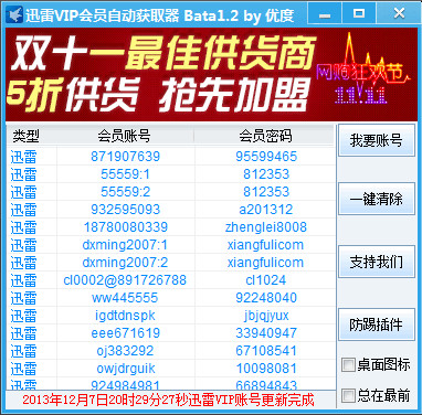 优度迅雷会员自动获取器一款功能强大、兼容性极佳的会员获取软件。该款软甲具备迅雷VIP会员自动获取器可以快速免费获取大量迅雷VIP会员帐号,享受加速下载、离线下载两大VIP功能,使得冷门资源下载速度得到大大提升,该款软件同时也是一款能够一键获取大量免费迅雷会员账号的软件,使用方便,完全没有多余的步骤。在这款软件之中在具有防踢插件功能,能够确保一个迅雷会员账号可以多个地点同时登陆使用。重点是本款软件绝对安全绿色,完全不用考虑病毒说明的之类的事情,请大家放心使用。