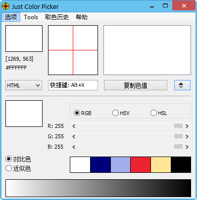 Just Color Picker 是一款绿色小巧而又实用的颜色拾取器,能够储存多组颜色并分别显示其html、RGB、hex、HSB、HSV与HSL代码,是网页设计师和数字艺术家必备的小工具。