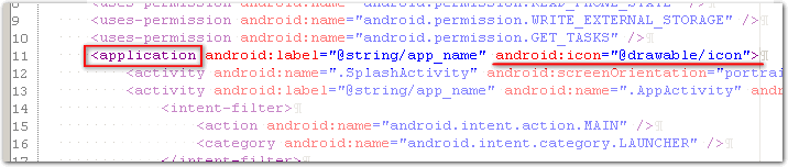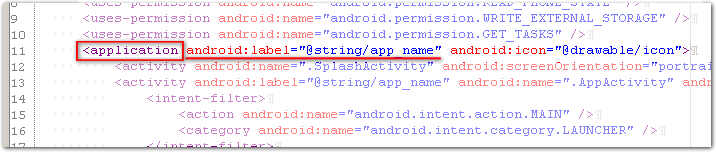 首选确认应用名称值保存在哪个位置:在资源浏览器中找到“AndroidManifest.xml”打开,找到“application”节点,找到其后类似“android:label=”@string/app_name””的字串,“@string/app_name”表示应用名称字符串的实际保存位置是在“res/values/strings.xml”文件中的 “app_name“键值中。