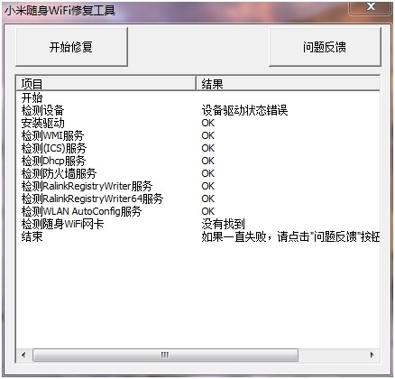 当你拿到小米随身wifi,也安装了驱动,插上后提示如下图:![]() 那么你可以参考本教程尝试解决该问题。(操作系统win7)当然,本教程提供的解决问题的方法希望也会大家有所启发。 下载后安装。安装成功后,桌面上出现对应图标。 ![]() 第二步:点击打开,开始检测 ![]() 分析结果,实施解决办法。 如上图,我的问题就是驱动安装正确,但是驱动状态有错误。 一般创建失败比较常见的第一大问题就是驱动有问题。 所以我想到的解决方案就是重新下载,重新安装驱动。 第三步:重新下载驱动,重新安装。 ![]() |