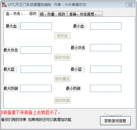 LP九天之门修改器(九天之门爆率补丁)是一款同名下的游戏辅助工具,该款辅助软件功能齐全,兼容性极佳,LP九天之门是一款角色扮演类游戏,玩家可以通过修改器来轻松玩游戏,LP仿传奇单机版九天之门修改器,对应版本的辅助工具,玩友自行制作,功能合理有效,让玩家改的放心,玩的开心,喜欢此类游戏的同学们千万不要错过哦!