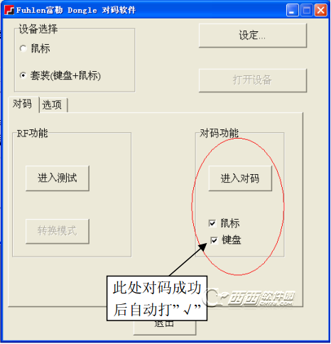 1.3 在“设备选择”处勾选“套装(键盘+鼠标)”选项,然后点击“打开设备”,如图四;