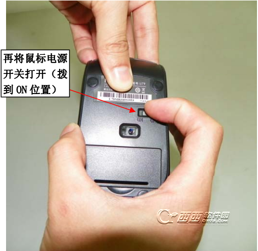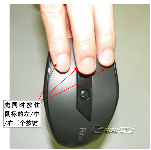 1.4 点击图五中的“进入对码”按钮,将鼠标靠近接收器20cm以内的距离,同时按住鼠标的“ 左、中、右”三个按键,再打开鼠标电源开关,如图六所示;待3秒后松手(此步动作需在30秒内完成),如果指示灯灭掉后鼠标能正常使用,即表示鼠标对码成功;
